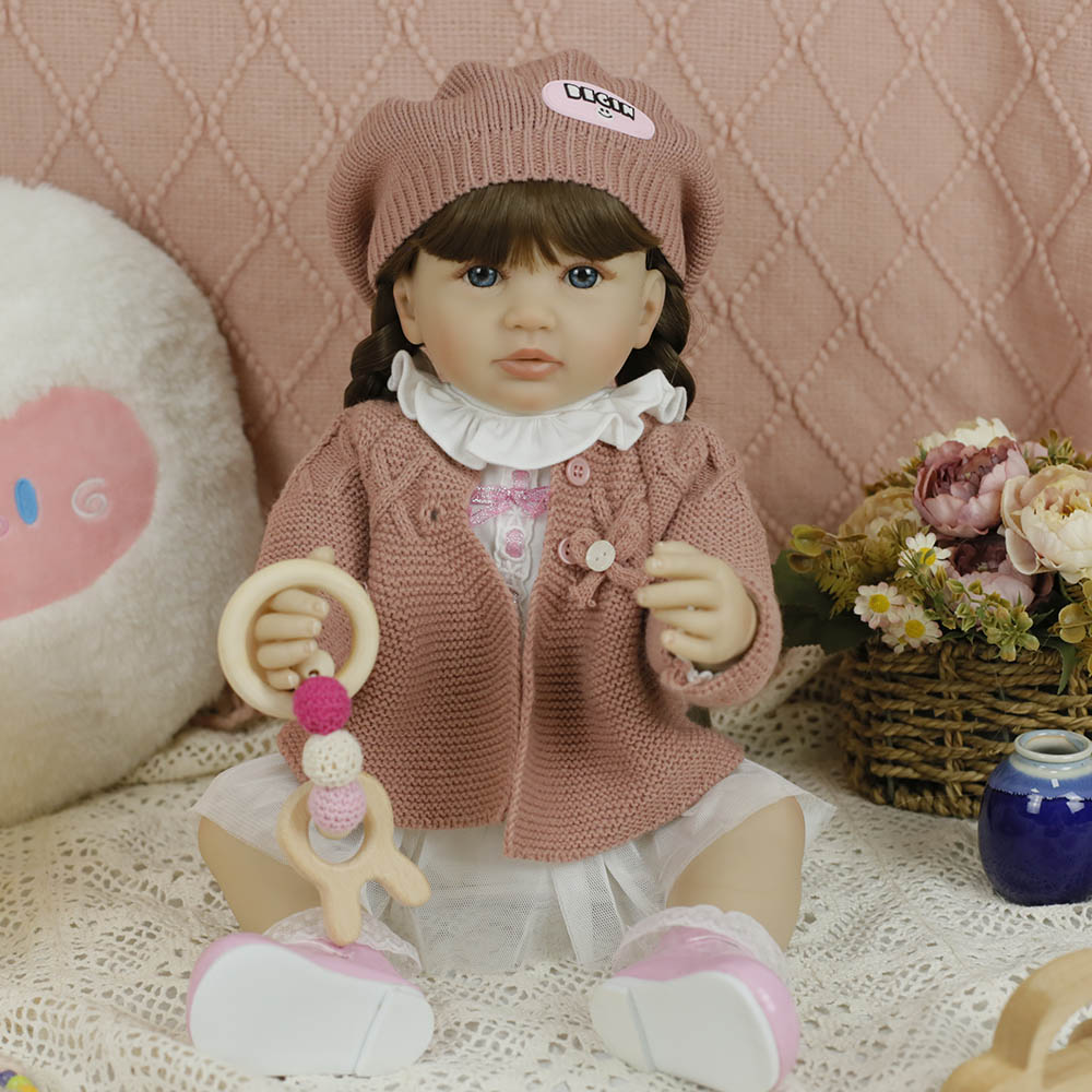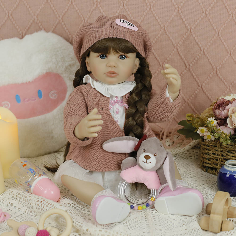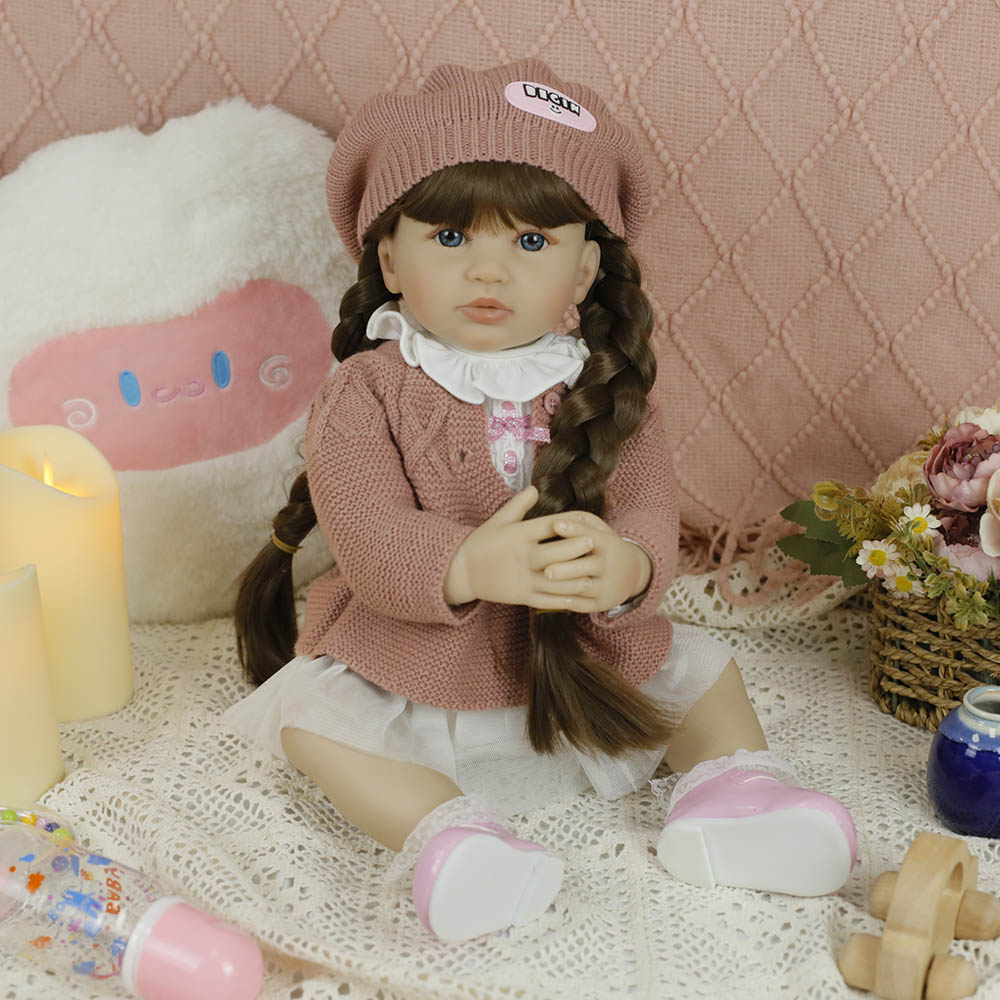 Caterina è una bambola Reborn raffinata e dettagliata, realizzata in silicone e vinile morbido, alta 55 cm. I suoi occhi azzurri brillano sotto un dolce cappellino color salmone, mentre i lunghi capelli castani sono raccolti in due eleganti trecce che le donano un aspetto tenero e vivace. Indossa un grazioso vestitino bianco abbinato a un gilet salmone, perfetto per esaltare la sua delicatezza. Le sue braccia e gambe articolabili le permettono di assumere pose naturali, rendendola ideale sia per il gioco che per la collezione. Realizzata artigianalmente, Caterina è morbidissima al tatto e viene corredata da un ciuccio e un biberon, rendendo l’esperienza ancora più realistica e coinvolgente.