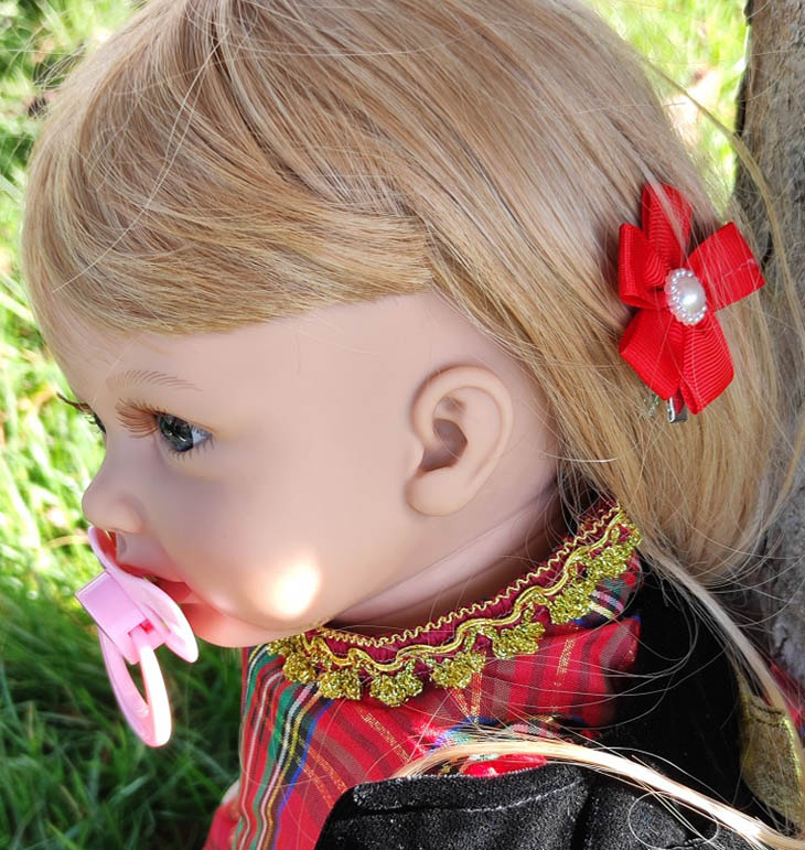 Oltre al suo aspetto realistico, questa bambola viene fornita come da foto con vestitino rosso, fermacapelli e un ciuccio, per migliorare l’esperienza di gioco.